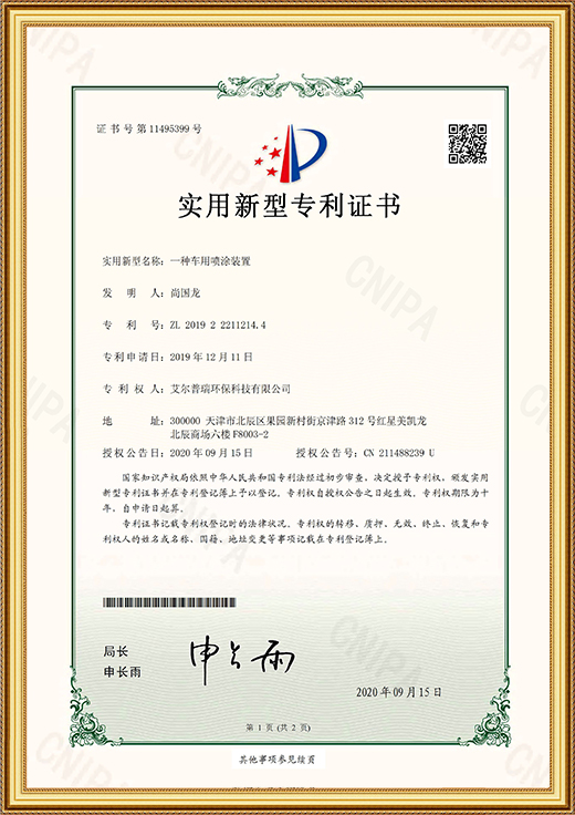• 實用新型專利證書(一種車用噴涂裝置)
