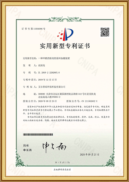 • 實用新型專利證書(一種甲醛清除劑的原料加載